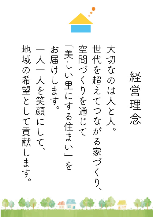人の暮らしの基盤である「家」をつくること。 その仕事を通して、地域の風景や「美しい里」での人の営みを支えていくこと。 これからも地域に根ざした工務店として、一軒一軒の家づくりに真剣に向き合いながら、 世代を超えて住み継がれる住まいをつくり続けてまいります。
